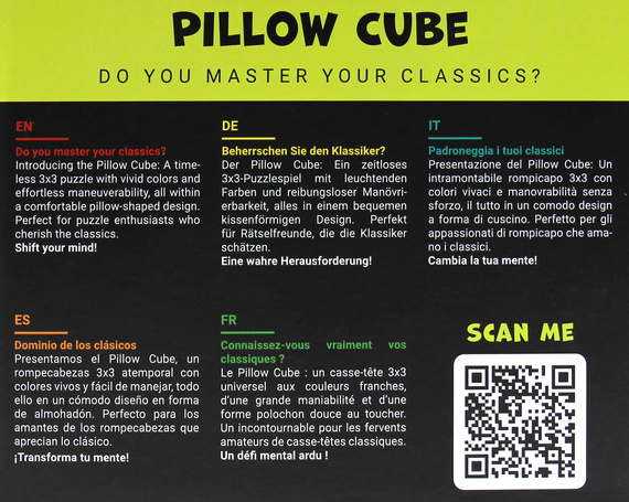 Czy znasz klasyczne łamigłówki? Prezentowany Pillow Cube to popularna układanka 3x3x3 w wygodnym kształcie poduszki. Żywe kolory oraz lekkość w obracaniu to jej podstawowe atuty. Idealna zarówno dla początkujących miłośników łamigłówek, którzy dopiero zaczynają swoją przygodę jak i dla zaawansowanych miłośników łamigłówek, którzy cenią klasykę.