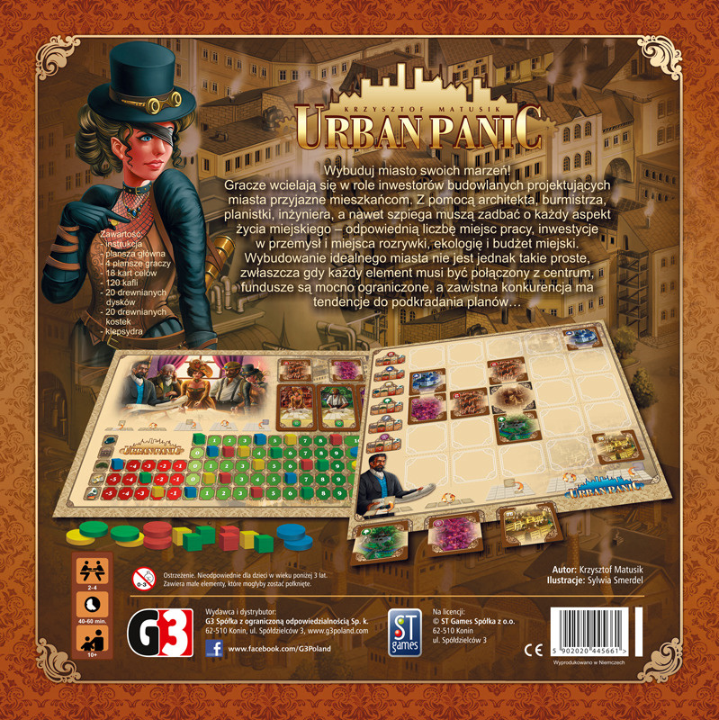 "Urban Panic" to kafelkowa gra planszowa, przeznaczona dla 2 do 4 graczy w wieku od 10 lat. Gracze wcielą się w rolę inwestorów budowlanych, projektujących miasta przyjazne mieszkańcom. Z pomocą architekta, burmistrza, planistki, inżyniera, a nawet szpiega, muszą zadbać o każdy aspekt życia miejskiego – odpowiednią liczbę miejsc pracy, inwestycje w przemysł i miejsca rozrywki, ekologię i budżet miejski.