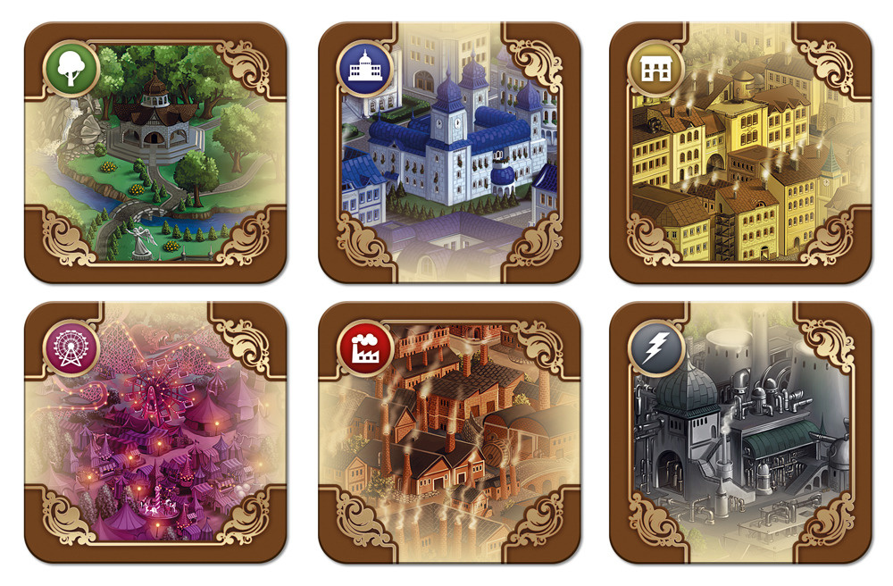 • imprezowy - w tym wariancie nie używa się planszy głównej. Nie ma podziału na tury. Wszyscy gracze, w tym samym czasie, losują kafle budynków z puli i układają je na swojej planszetce. Gracz, który zrobi to jako pierwszy, obraca klepsydrę. Po jej przesypaniu gra się kończy. Gracz, który uruchomił klepsydrę otrzymuje dodatkowe pięć punktów.