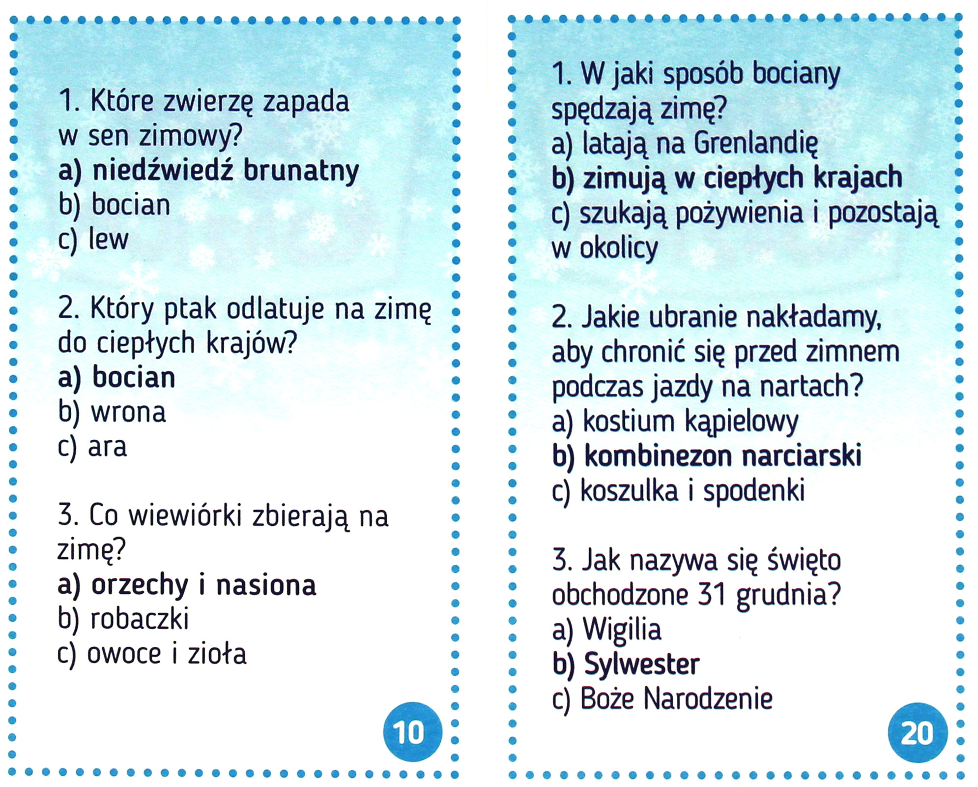 Ile trwa noc polarna? Gdzie znajduje się wioska Mikołaja? Czym jest śnieg? Na kartach znajduje się wiele ciekawych i zabawnych pytań, w sam raz na rodzinne, zimowe wieczory. Poznaj tajemnice zimy i odkrywaj wiele ciekawostek. Gra zawiera pytania specjalnie przygotowane dla dzieci i rodziców.