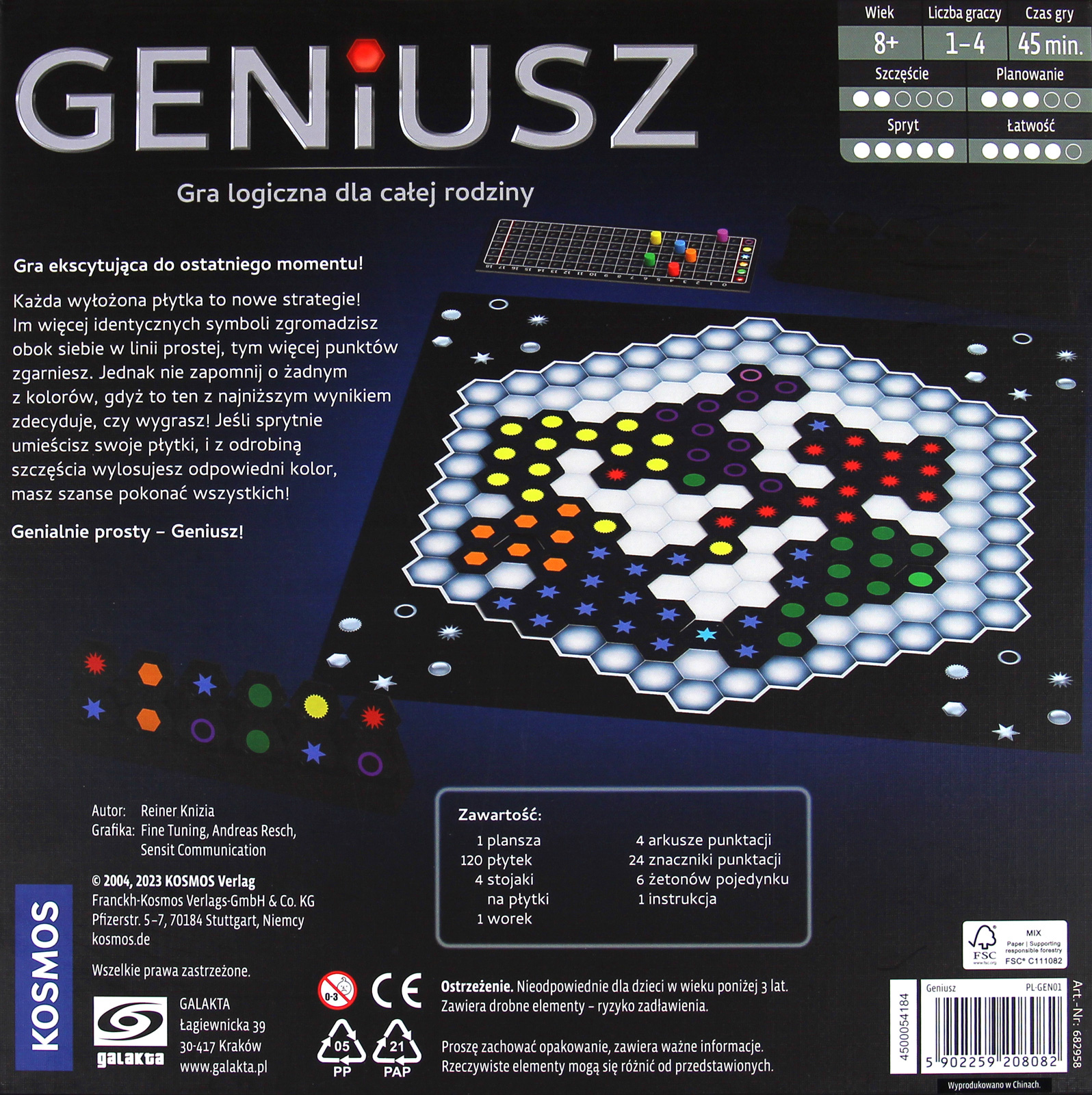 W grze Geniusz na zmianę z pozostałymi graczami umieszczasz płytki na planszy i próbujesz zdobyć jak najwięcej punktów, dopasowując kolorowe symbole. Im więcej płytek z takimi samymi kolorowymi symbolami znajdzie się obok siebie, tym więcej punktów możesz zdobyć. Gracz z najwyższym wynikiem na koniec gry wygrywa!