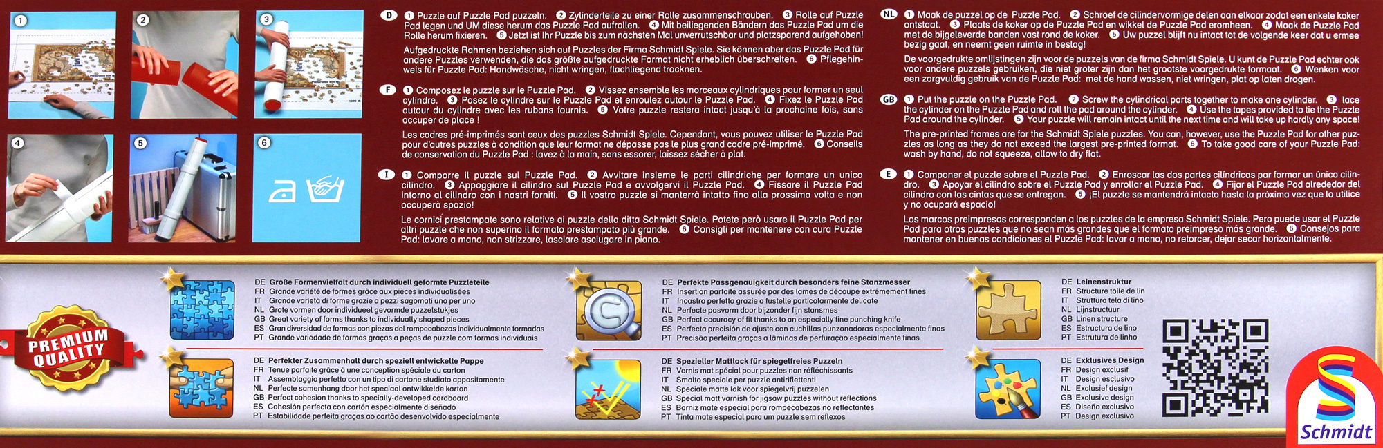 Za każdym razem, gdy przerywamy układanie na dłuższy czas lub gdy zakończymy tworzenie naszego dzieła, należy skręcić dwie cylindryczne części tak, aby tworzyły jeden cylinder, a następnie umieścić go na macie i owinąć ją dookoła niego. Pomocna przy umocowaniu jest taśma dołączona do zestawu, która uniemożliwia rozwinięcie maty. Tak zapakowane puzzle praktycznie nie zajmują nam miejsca. Można je rozłożyć w każdej chwili i kontynuować układanie. Wszystkie elementy są w macie idealnie zabezpieczone i nigdy nie zmienią swojego położenia.