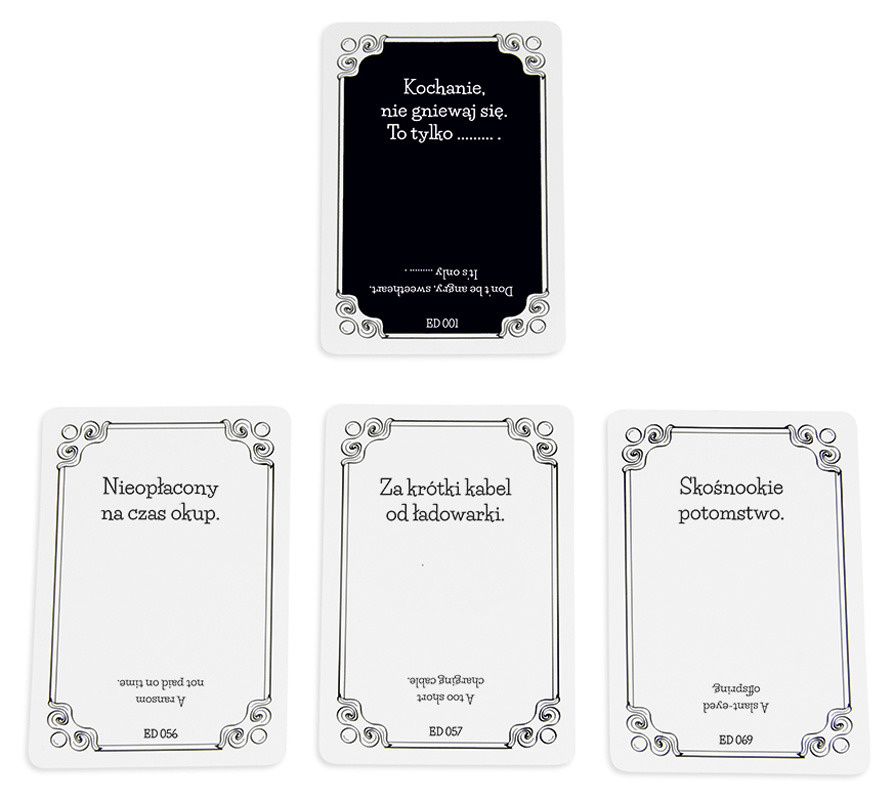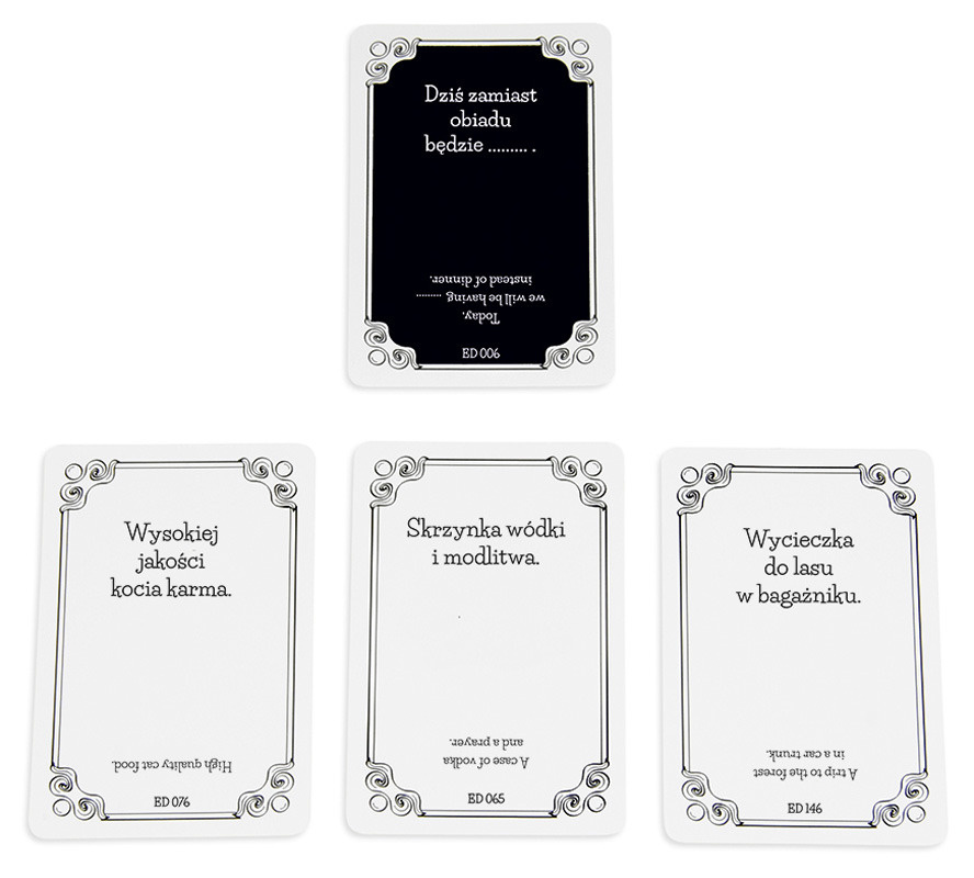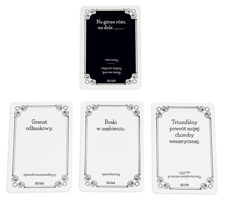 Karty Dżentelmenów to pierwsza na polskim rynku, dwujęzyczna seria gier tekstowych, które umożliwiają wspólną zabawę z anglojęzycznymi znajomymi! Kieszonkowe pudełko zawiera 220 plastikowanych kart na profesjonalnym papierze karcianym z wkładką węglową.