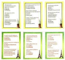 Dynamiczna gra rodzinna, w której dzieci i rodzice rywalizują, odpowiadając na wiele interesujących i zabawnych pytań, specjalnie przygotowanych dla dzieci i dla rodziców. Gdzie zobaczymy Koloseum, a gdzie Big Ben? Z czym kojarzy się Toruń? W jakim mieście jest Wieża Eiffla? Jak nazywa się stolica Hiszpanii? Wygrywa drużyna, która odpowie na więcej pytań.