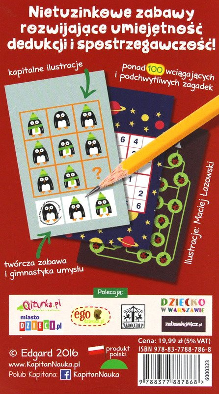 Ponad 100 wciągających, podchwytliwych zagadek i łamigłówek! Ćwiczą spostrzegawczość, umiejętność skupienia uwagi i myślenie logiczne, a przede wszystkim gwarantują świetną, twórczą zabawę.