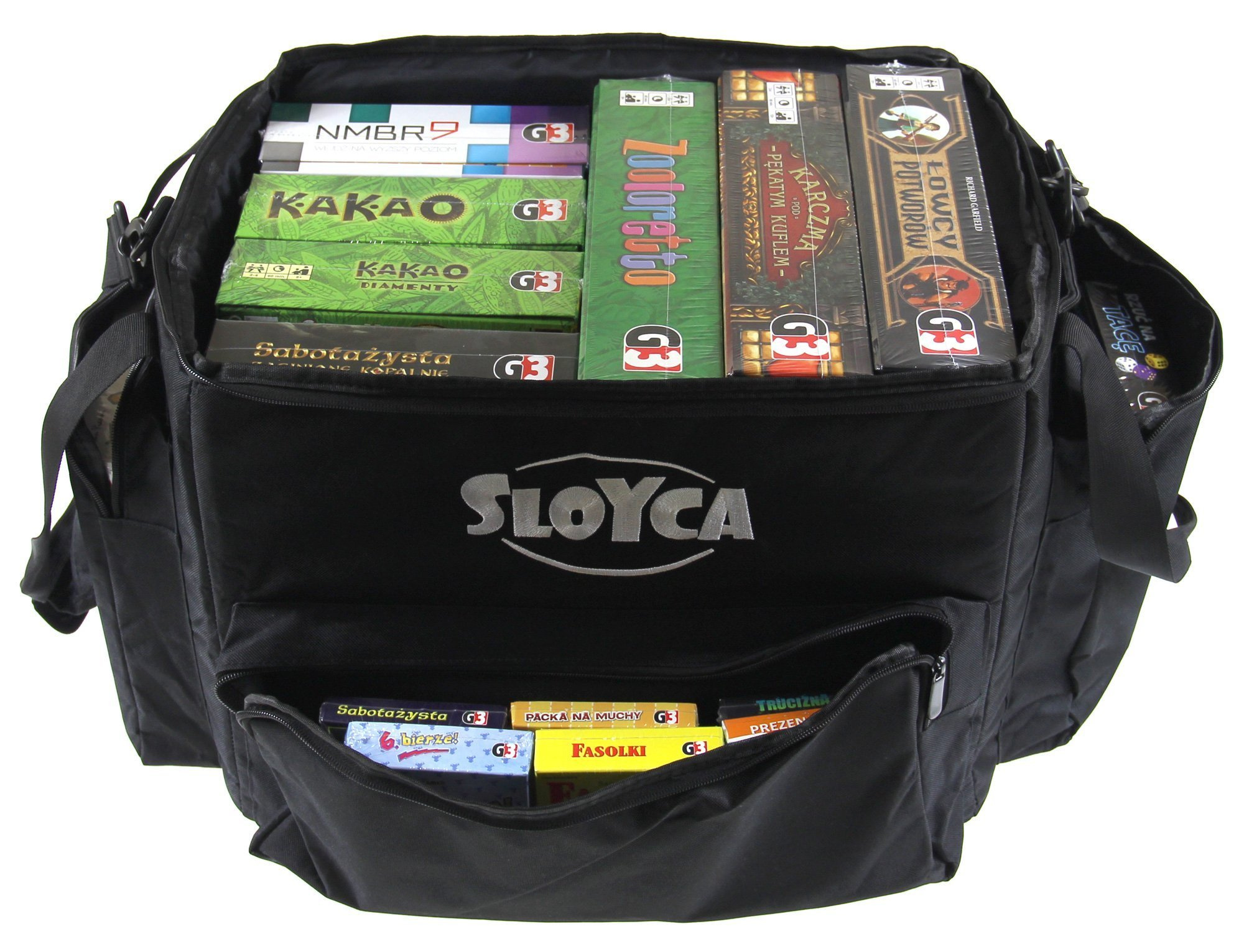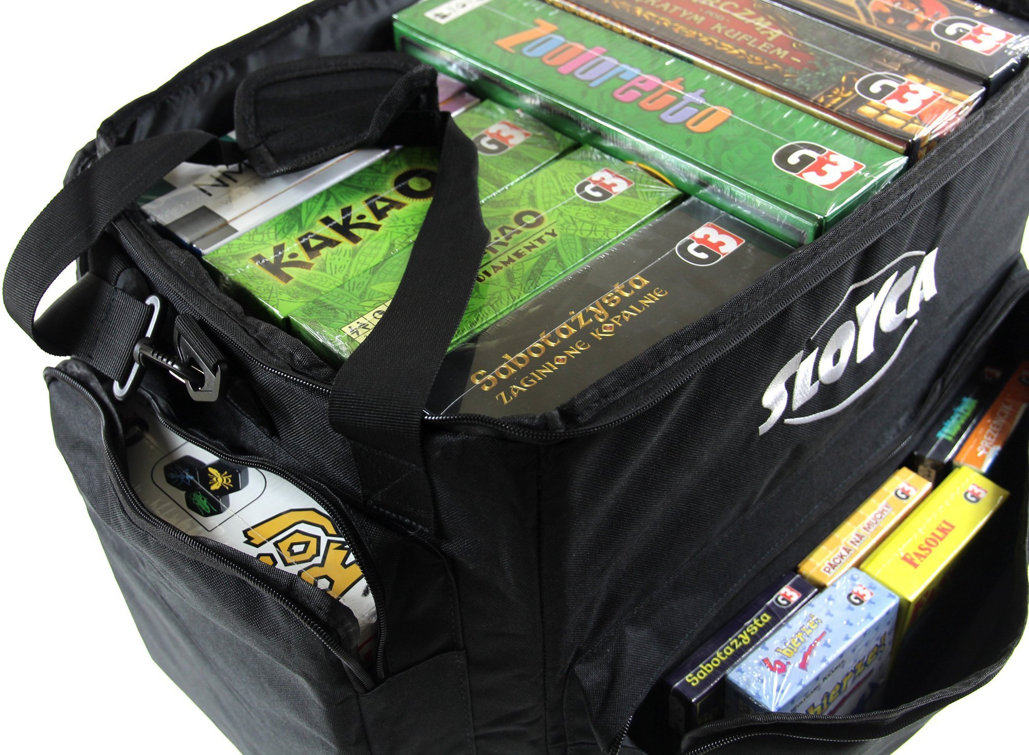 Wnętrze pomieści pięć dużych pudełek (np. Zooloretto - 295x295 mm), ale też dużo większe pudełka, jak np. Cyklady. Torba posiada dodatkowo aż trzy zewnętrzne kieszonki: dwie po bokach torby oraz jedną na frontowej ścianie. Każda boczna kieszonka pomieści grę wielkości 220x230 mm, czyli np. Rój, Halli Galli, Tajniaków czy Pędzące Żółwie. Kieszonka przednia mieści mnóstwo małych gier karcianych. Wszystkie kieszenie zapinane są na plastikowe, czarne zamki błyskawiczne.
